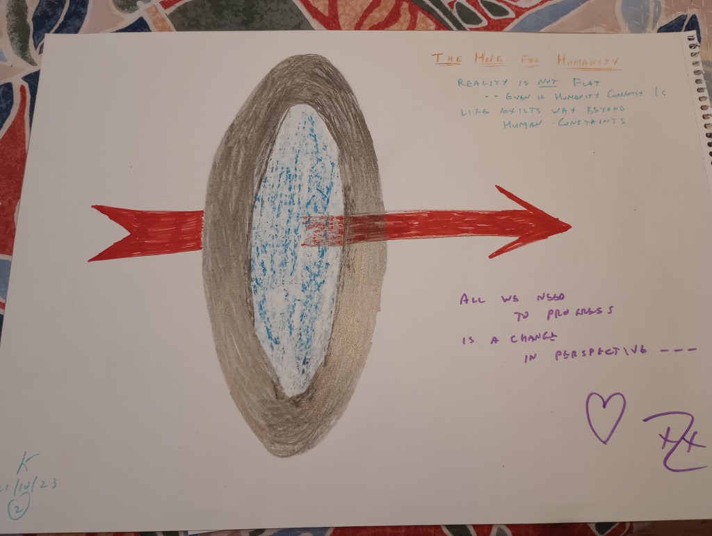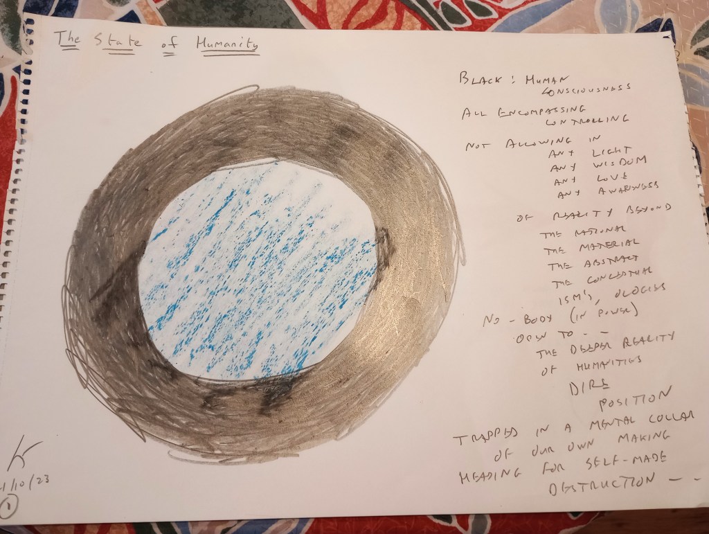 By now, with how I was feeling released, something more positive was moving inside me. So, I took another piece of paper and allowed another drawing to materialise. Then I added a title and a few poetic words of explanation: